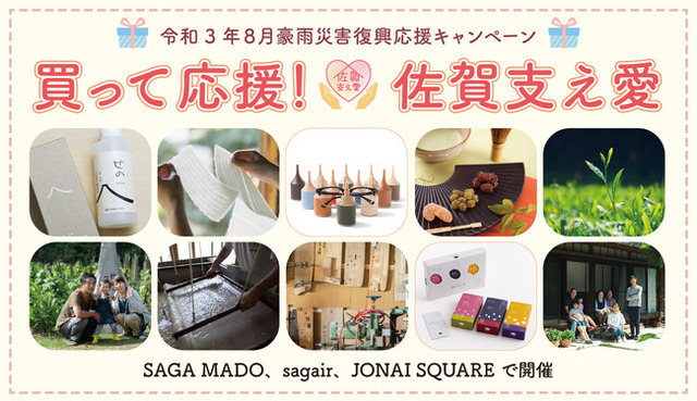 今回、「SAGA MADO」「sagair」(運営:さが県産品流通デザイン公社)、「JONAI SQARE」(運営:(株)ライフプロ)の3店舗にて出品いただいている被災された県内事業者の商品を対象に、「買って応援!佐賀支え愛」秋のプレゼントフェアを開催します。