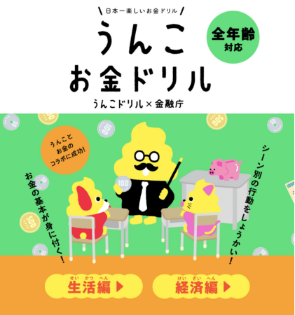 金融庁とうんこドリルというコラボレーションが大きな話題となった第一弾「うんこお金ドリル(生活編)」につづく第二弾となる「うんこお金ドリル(経済編)」。商売にまつわるお金の基本をクイズ形式で楽しく学べるWEBコンテンツです。