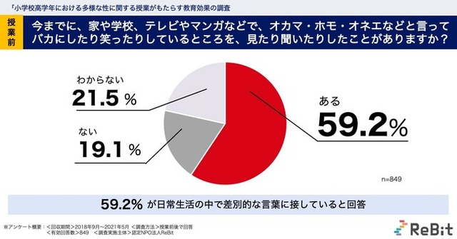 授業前に「今までに、家や学校、テレビやマンガなどで、オカマ・ホモ・オネエなどと言ってバカにしたり笑ったりしているところを、見たり聞いたりしたことがありますか?」と聞いたところ、59.2%が「ある」、21.5%が「わからない」と回答し、「ない」と回答したのは19.1%でした。このことから、小学校高学年の約6割が、日常生活の中で差別的な言葉に接していることがわかります。