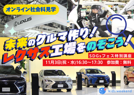 子ども向け「教育×オンライン」の分野では、日本最大級のプラットフォームである「キッズウィークエンド」を運営するキッズシーズ株式会社(本社:東京都中央区)と、トヨタ自動車九州株式会社(本社:福岡県宮若市)は、全国の小学生以上の子どもを対象に、オンライン授業「レクサス工場を生中継!SDGsに取り組む未来のクルマ作り」を、11月3日(水・祝)16:30より開催します。受講は無料です。