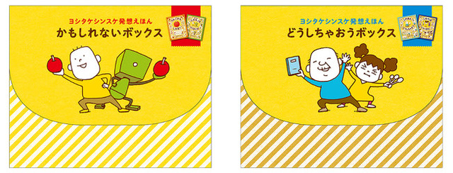 ボックス本体は四つ折りの封筒のような形状で、展開すると、ヨシタケシンスケさん描きおろしのイラストとメッセージが描かれており、開ける楽しさがあります。価格も発想えほん2冊分と変わらず、お得で特別感のあるセットになっています。
