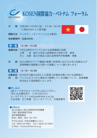 独立行政法人 国立高等専門学校機構 宇部工業高等専門学校(山口県宇部市 校長:山川昌男)は、ベトナムで行っている高専教育の特徴を生かした国際協力に関するフォーラムを2021年11月19日(金)にオンラインで開催します