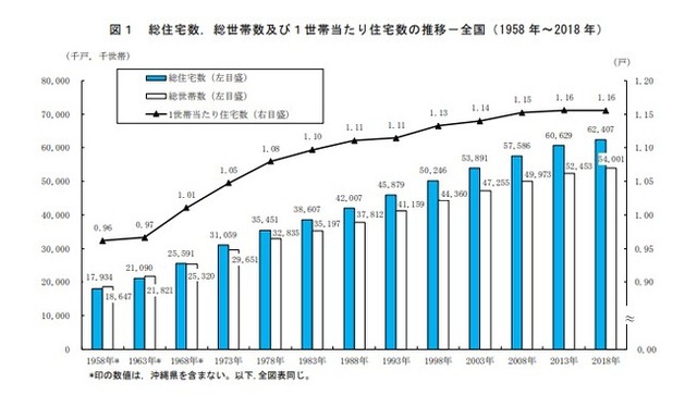 また、総務省による平成 30 年住宅・土地統計調査でも、年々空き家が増え続けていることが伺えます。引用元:「平成30年住宅・土地統計調査 住宅及び世帯に関する基本集計結果の概要」 (http://www.stat.go.jp/data/jyutaku/2018/pdf/kihon_gaiyou.pdf)
