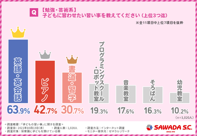 文化系の習い事の王道とも言えそうな『英語』『ピアノ』『習字』に、多くの回答が集まる結果となりました。