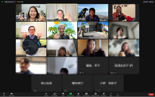 広報担当の職員とPR犬が介助犬デモンストレーションによる作業紹介、実際に介助犬と生活をされている介助犬使用者&介助犬ペア2組にもリモートで参加してもらい、介助犬を持つことで変わったことや現在介助犬にお願いしている作業、未来の医師たちへの想いなどを話した。岡山県岡山市の藤原さん(介助犬ダイキチ)はアダプティブサーフィンの魅力を語り、日本代表として近く世界大会に臨むことを報告した。愛知県名古屋市の丹羽さん(介助犬ケビン)は多発性硬化症の不安定な症状が、介助犬が来たことで安定し、朝から夜までずっと楽しい生活になったことを報告し、一方、リハビリ通院していた大学病院から同伴拒否に遭い、病院を変えなければならなかったことがとても悔しかった、と想いを語った。