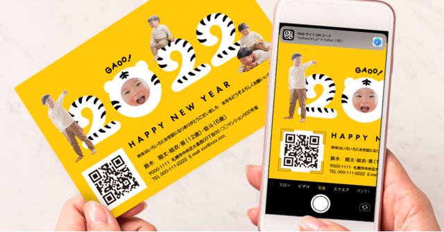 動画の載せ方はとっても簡単。お好みの年賀状デザインを選択後、編集画面から5秒間の動画を撮影、その場でQRコードスタンプに変換されるので、それを年賀状デザイン面に自由に配置すれば完了です。受け取った相手は、スマートフォンでQRコードを読み取るだけで動画を再生できます。