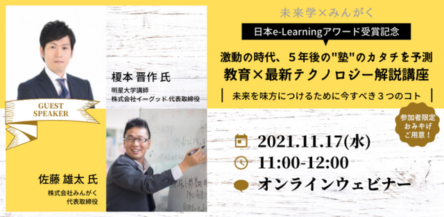オンライン自習室専門システム&運営代行「みんがく」を提供する株式会社みんがく(本社:東京都目黒区、代表取締役:佐藤雄太)が、「塾関係者必見!これだけは抑えたい、教育×最新テクノロジー解説講座~5年後の"塾"のカタチを大予測~」を開催することを決定いたしました。先月発表の「日本e-Learningアワード」の受賞を記念して開催されます。ゲストに明星大学で「未来学」を教える榎本晋作氏を迎え、未来の"塾"のカタチについて、最新テクノロジーの動向という切り口で語っていただきます。ウェビナー形式で開催、参加費は無料です。
