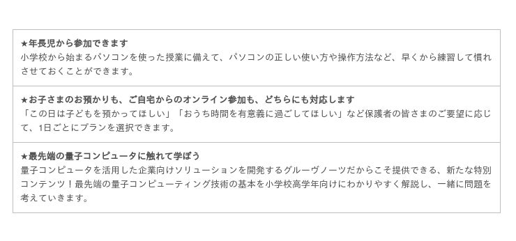 グルーヴノーツは、世界に先駆けてAIと量子コンピュータを活用したクラウドサービスの開発を手掛け、国内有数の実績を誇るテクノロジーカンパニーです(https://www.magellanic-clouds.com/blocks/)。グルーヴノーツが展開するテックパーク教育事業では、社会をより良くしていくテクノロジーを正しく理解して、楽しみながら実践的な活用力を身に付ける教育機会の提供に努めています。テクノロジーの楽しさと可能性を広げることで、子どもたちや両親、教育現場の活動を支援し、より良い社会づくりへの貢献を目指しています。