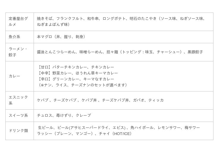当日は7つのキッチンカーが出店を予定しています。提供するメニューは下記の通りです。