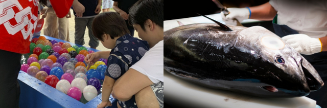 家族で「座 盆祭(ざ ぼんさい)」に遊びに来て楽しんでいただくため、「射的」、「ヨーヨー釣り」などが楽しめるお祭り縁日や、キッチンカーによる「たこ焼き」、「焼きそば」などのお祭り屋台グルメ、獲れたての本マグロも提供します。