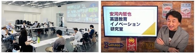 ▲左:大崎洋氏(超客員教授)による講義風景、右:活動報告会での安河内哲也氏(客員教授)による報告の様子。