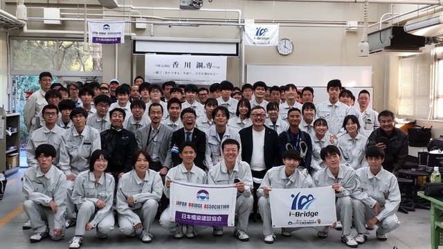 香川高等専門学校(香川県高松市 校長:田中 正夫 以下「香川高専」)は、建設環境工学科3年生を対象として「香川鋼橋高等専門学校」と題して特別プログラムを実施しました。当日は、橋梁業界で働くプロから橋梁の魅力や当たり前にあるインフラを維持し守ることをテーマに講話が行われ、若手技術者の体験談の他、高専生が橋梁メンテナンスの現場で行われている錆の除去や亀裂の探査などを実際に体験しました。