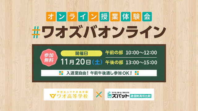 「ズバット」を中心とした比較サイトを展開する株式会社ウェブクルー(本社:東京都世田谷区、代表取締役社長:藤島義琢)は、学校法人ワオ未来学園 ワオ高等学校(所在地:岡山県岡山市北区、理事長:西澤昭男 以下、ワオ高等学校)とともに、2021年11月20日(土)に通信制高校への進学を考える中学生、転編入を考える高校生とその保護者へ向けたオンライン授業体験会「#ワオ ズバ オンライン」を開催いたします。
