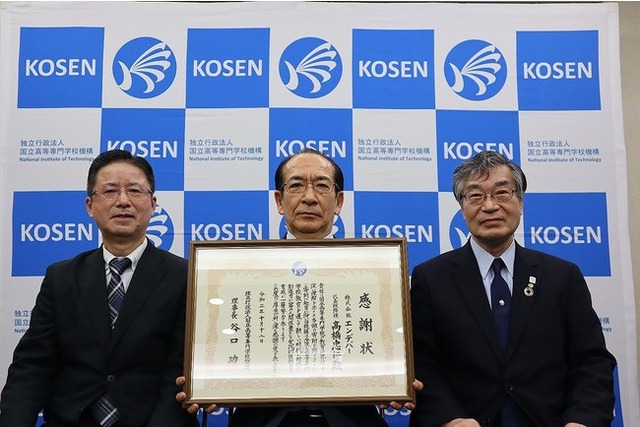 鹿児島工業高等専門学校(鹿児島県霧島市 校長:氷室昭三 以下「鹿児島高専」)3期生の株式会社エンデバー代表取締役 高橋忠仁氏(鹿児島県熊毛郡屋久島町出身)は鹿児島高専を訪れ、高専生の育成のために役立ててもらおうと、鹿児島高専と高専機構に5千万円ずつ、合計1億円の寄附を行った。去る10月12日に高専機構本部において、機構の谷口理事長と鹿児島高専の氷室校長から感謝状の贈呈があった。