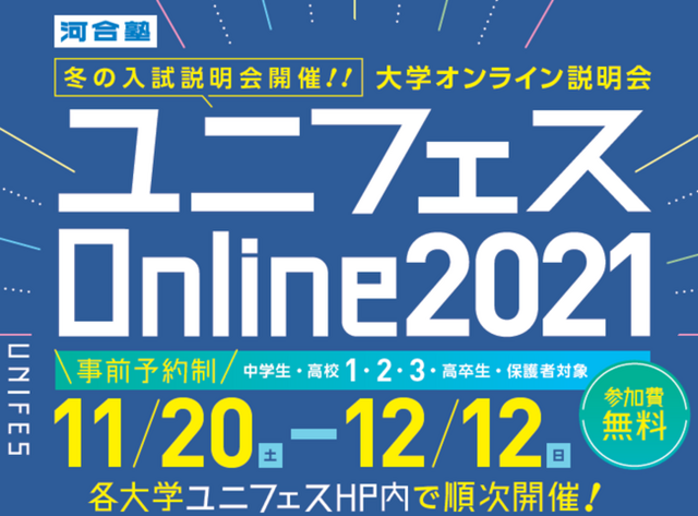 河合塾は、11月20日(土)から12月12日(日)にかけて、冬のオンライン合同大学説明会『ユニフェスOnline 2021 冬の入試説明会』を開催します。全国から82校の大学が参加し、あと2カ月と迫った入試に向けて最新情報を提供します。コロナ禍による入試への影響も想定される中、大学から受験生に直接情報を伝える貴重な機会です(共催:(株)KEIアドバンス)。