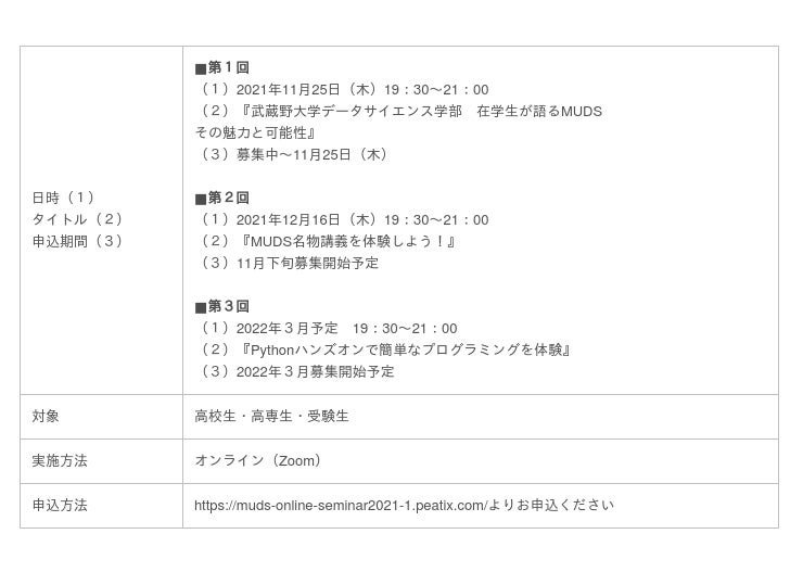 ■MUDS高校生データサイエンスONLINEセミナー2021案内ページ:https://peatix.com/group/7338453/