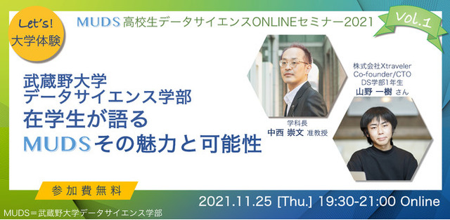 第1回では、起業しながらMUDSへ入学した山野 一樹さん(MUDS1年生)が登壇します。「起業に至った経緯や方法」「データサイエンスの学び」「MUDSで学ぶ魅力や可能性」について学生目線で高校生・高専生にお伝えします。また、高校生・高専生・受験生が学生、教員に質問できる時間を設け、双方向で進めながらデータサイエンスの価値・魅力、データサイエンスを学ぶことの重要性と未来への展望、楽しさを感じられる機会を提供します。