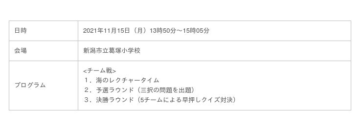 一般社団法人日本知識士協会は、クイズ王・古川洋平プロデュース/出演の「海のライブ・クイズイベント」を2021年11月15日(月)に開催いたします。(新潟市立葛塚小学校5年生117名が対象です)