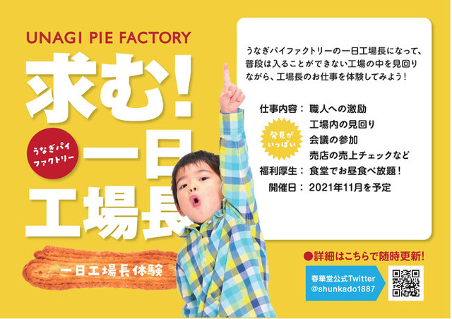 有限会社春華堂(本社:静岡県浜松市、代表取締役社長:山崎貴裕)は、2021年11月13日(土)、一般公募で選ばれた小学生を対象に「一日工場長体験 第一弾」と称して職業体験ができる企画をうなぎパイファクトリー(静岡県浜松市西区)で実施いたします。