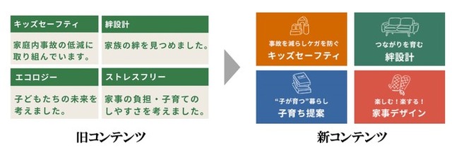 近年、生活様式の変化、人々の考え方の多様化など、家づくりの環境は大きく変化しています。アイフルホームでは、特に現在の「家に対する価値観」や「子育てにまつわる考え方」に着目し、今までの「キッズセーフティ」「絆設計」「ストレスフリー」「エコロジー」という4つを見直し、「ストレスフリー」と「エコロジー」を「家事デザイン」と「子育ち提案」に再定義しました。