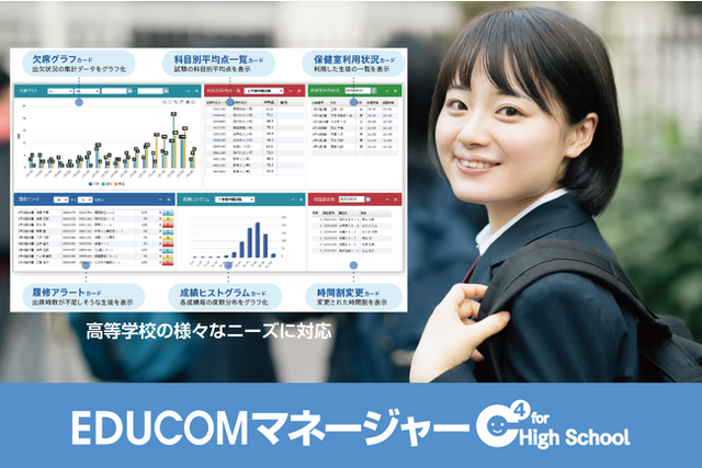 EDUCOMは、これまで全国の約440自治体、約8,800校(2021年10月時点)の小学校及び中学校を対象に統合型校務支援システム「EDUCOMマネージャーC4th」をクラウドあるいはオンプレミスで提供しています。この度EDUCOMは、サービスの提供対象を拡大するために、高等学校向け統合型校務支援システム「for High School」を、高校市場で実績のあるテクノコーポレーション株式会社(本社:熊本、代表取締役:米崎司)と共同で開発し、製品ラインナップに加えました。