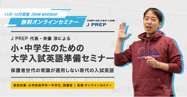 小学生・中学生・高校生対象の英語塾 J PREPを運営する株式会社J Institute(本社:東京都目黒区、代表取締役:齋藤淳)は、「小・中学生のための大学入試英語準備セミナー ─ 保護者世代の常識が通用しない現代の英語入試 ─」(5テーマ×2回の全10回・全回無料) を、2021年内にオンラインで開催します。