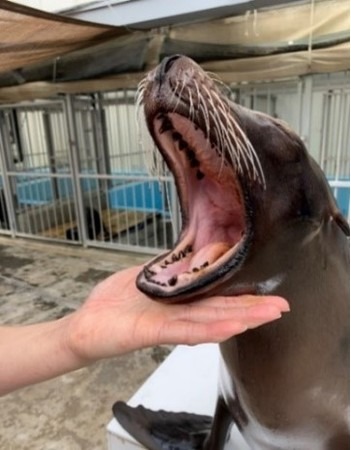 本研究では、口の中を観察しやすい動物としてアシカに注目して、よみうりランド・アシカ館の協力によりアシカショーに登場しているカリフォルニアアシカを対象に研究を始めました。よみうりランドではアシカたちに定期検診をして、腎臓、心臓、肝臓、胃、消化管、膀胱のエコー検査なども実施して健康管理に努めています。