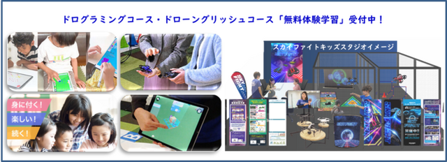 指 導:ドローンネット本社付近に専用オンラインスタジオを新設、オンラインライブ配信による指導と、 スカイファイトキッズスタジオ各店舗のドログラミング講師が連携し授業を行います。