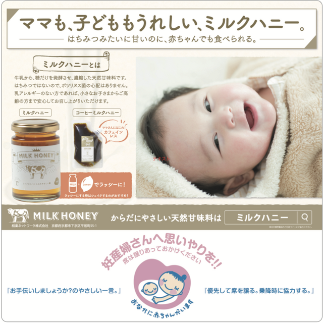 相楽ネットワークでは、牛乳から作った全く新しい天然甘味料である「ミルクハニー」を販売しています。ミルクハニーは、はちみつではないため、ボツリヌス菌の心配はなく、小さいお子さまからご高齢の方まで安心してお召し上がりいただけます。また、ミルクハニーからつくったラテベースである「コーヒーミルクハニー」は、カフェインレスコーヒーを使用し、 妊産婦さまも、やさしい甘さの美味しいコーヒー牛乳を飲んでいただけます。