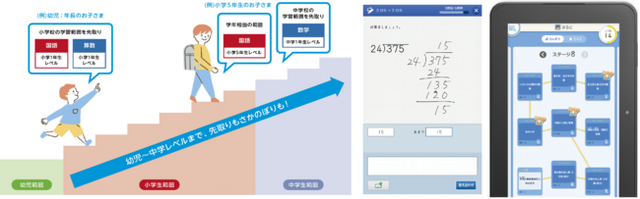 新たに提供する「無学年学習[コアトレ]」とは、算数・数学、国語に特化し、幼児から中学生レベルまで学年を超えて“先取り”や“さかのぼり”ができる教材です。例えば、年長のお子さまが、小学生以上の単元に取り組んだり、小学5年生のお子さまが、小学6年生以上の単元に挑戦できるようになります。また、算数・数学では、計算力を高めるだけではなく、「数的処理能力」「図形認識力」を同時に伸ばします。国語では、漢字・語彙・文法などの基礎を身につけながら、文の仕組みを読み解く力を伸ばし、タブレット学習だからこそできる体系的なカリキュラムにより、学力の体幹を鍛えていきます。