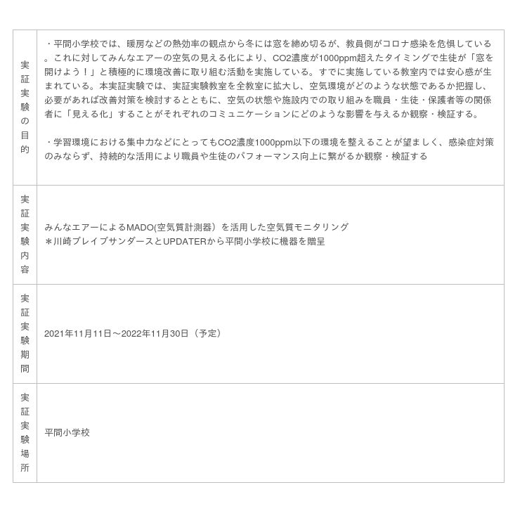 「顔の見えるライフスタイル」の実現を目指す株式会社UPDATER(2021年10月1日 みんな電力株式会社より社名変更、所在地:東京都世田谷区、代表取締役:大石英司、以下 UPDATER)は、市立平間小学校(所在地:川崎市中原区、校長:佐川昌広、以下 平間小学校)とプロバスケットボールクラブ「川崎ブレイブサンダース」(所在地:川崎市幸区、代表取締役:元沢 伸夫)と共同で、平間小学校の教室環境における空気質モニタリングで感染症対策および、コミュニケーションや学習効率に与える影響を観察・検証することを目的に、実証実験を開始いたしますので、お知らせいたします。