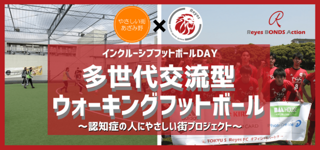 東急SレイエスFCは、やさしい街あざみ野実行委員会の「あざみ野商店会を中心に、認知症になっても安心して過ごせる街づくり・インクルーシブ社会の実現」という考えに賛同し、認知症者・支援者の関係にとどまらず、あざみ野商店会を中心に地域住民・学校・企業と多様な地域の構成員が認知症の方々とサッカーを通じて触れ合い、認知症理解を醸成する取り組みを実施いたします。