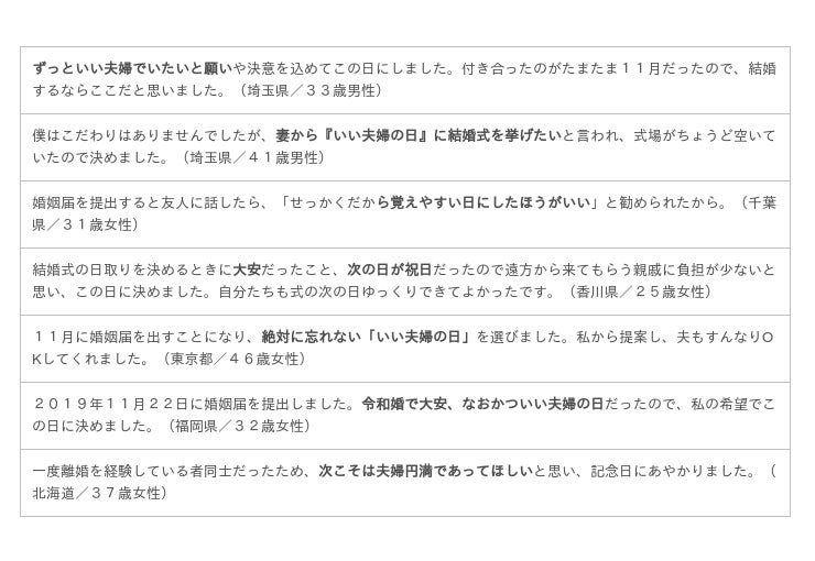 「いい夫婦の日」に結婚した人のコメントからは、「絶対に忘れたくない」「忘れてほしくない」という思いから自分またはパートナーが強く希望するというパターンがあるようです。