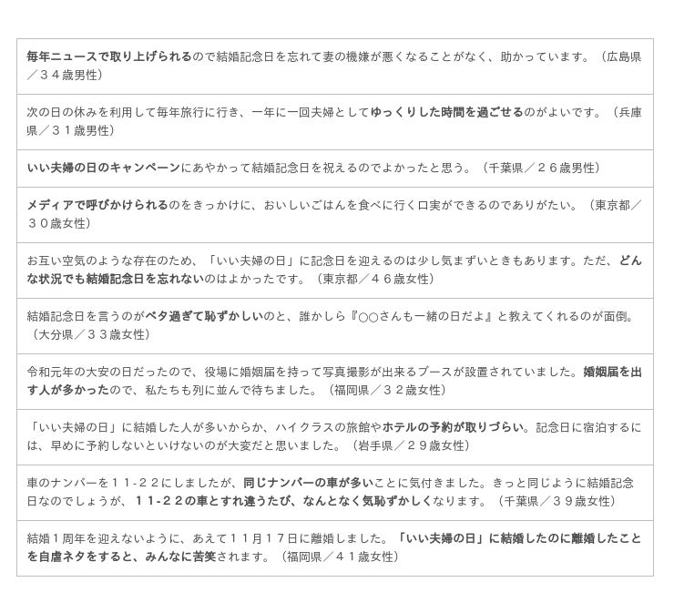 また弊害というほどではないものの、「いい夫婦の日」を結婚記念日にしたことで「気恥ずかしい」「予約が取りづらい」「役所が混んでいる」といった声も聞かれました。「1122の車のナンバーが多い」というコメントも多く、「いい夫婦の日」に結婚した人にしかわからない“あるある”と言えそうです。