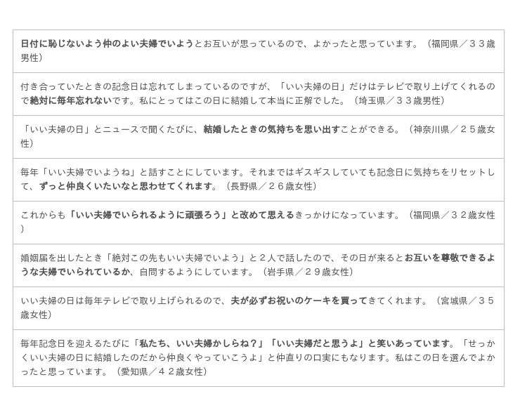 「いい夫婦の日」が来るたびに、お互いが夫婦円満のために努力しようとしていることがコメントからうかがえました。「記念日にふさわしい夫婦でいたい」という意識があるからこそ、いい夫婦の日を結婚記念日に選んだ人の70%が"夫婦円満”という結果につながっているのかもしれません。
