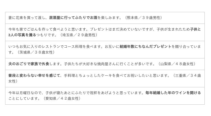 今年の結婚記念日の具体的な過ごし方を聞いてみました。