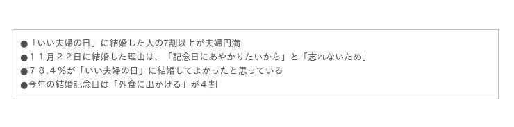 まさに「いい夫婦」を体現しているような過ごし方ばかりです。いい夫婦の日であれば結婚記念日を忘れずにお祝いすることができる、そのことが夫婦円満に一役買っている可能性もあるのかも知れません。
