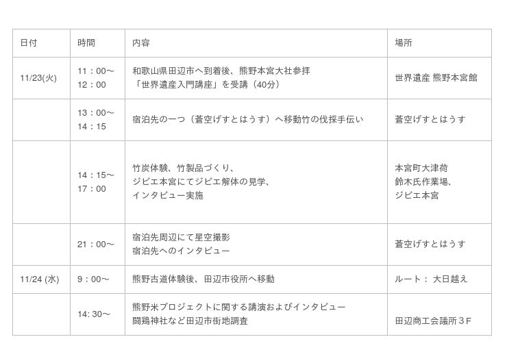 2日目は熊野参詣道を散策して映像素材を集めたあと、田辺市中心部に戻り、地産地消を推進している地元の生産者にインタビューを行い、竹の加工品やジビエ料理を観光資源として活用できるかその方策を考えます。一連のフィールドワークの模様は動画でも撮影し、それ自体を地域の魅力を掘り起こすPR動画としてYouTubeを通じて発信することにしています。