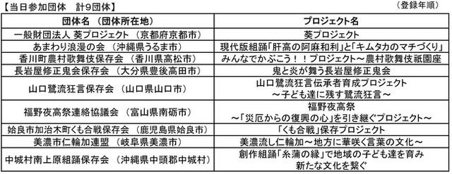2020年、2021年度は、新型コロナウイルス感染症の拡大防止の観点から、新たな「プロジェクト未来遺産」の募集、登録は中止し、特にコロナの影響を受けている無形分野の「プロジェクト未来遺産」へ支援を行いました。その一環として、2021年11月19日(金)に「オンライン交流会」を開催し、活動を推進していくうえでの課題や工夫等について、参加した9団体同士の意見交換を行いました。