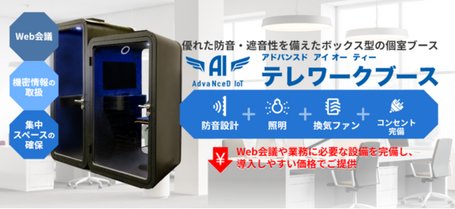 AdvaNceD IoT テレワークブースは、優れた遮音性を持つボックス型の個室ブースです。今まではWeb会議専用の遮音ブースとして、多くの企業様のオフィスやコワーキングスペース様に導入をいただいてきました。この度、新型コロナウイルスの影響で就職活動もオンライン化が普及したことに伴い、オンライン面接にもご利用いただけるよう大学向けに販売を開始いたしました。