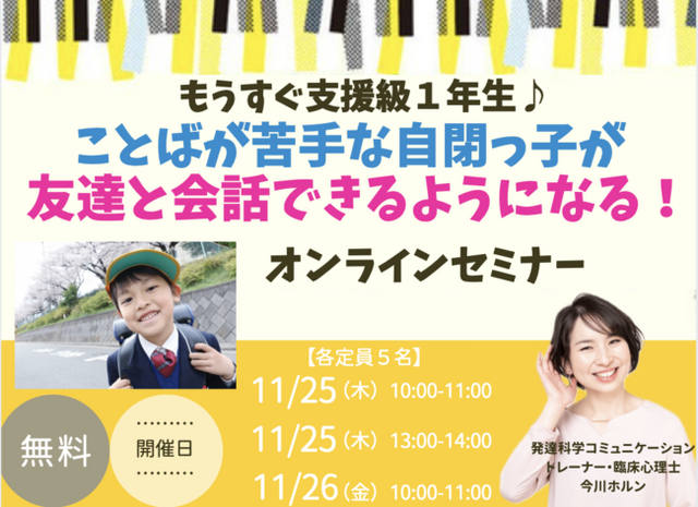この度、『もうすぐ支援級1年生♪ことばが苦手な自閉っ子が友達と会話できるようになるオンラインセミナー』募集スタートいたしました。