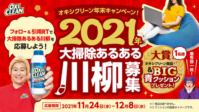 2021年もラストスパート!今年もオキシクリーンから特大年末プレゼントキャンペーンをご用意いたしました!題して「大掃除あるある川柳募集!2021年オキシクリーン年末キャンペーン!」年末にかけて、仕事に勉強、大掃除と忙しくなる時期。そんな皆様の息抜きとなるようなキャンペーンになることを願っております!たくさんのご応募、心よりお待ちしております。