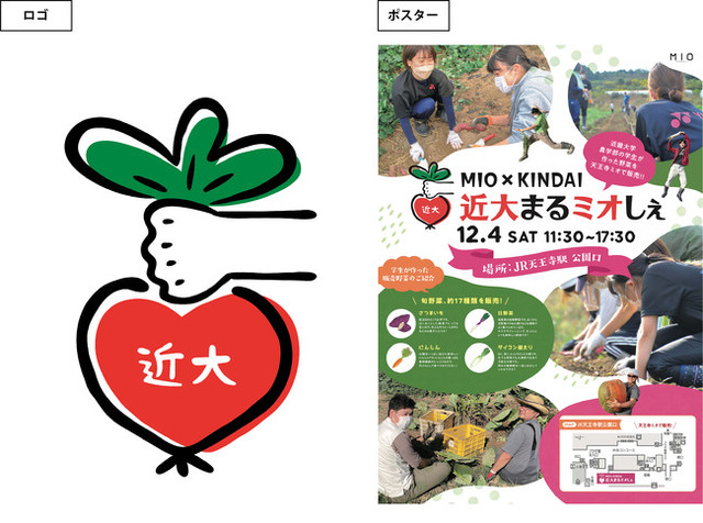 「近大まるミオしぇ」を実施するにあたり、近畿大学農学部の学生と共に企画デザインを行っております。以下のロゴ、ポスター、商品説明等についても、学生がデザイン案を考え展開をしてまいります。