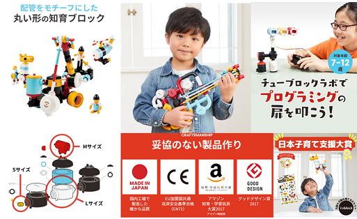 右脳も左脳も育てるおもちゃ「チューブロック」は、日本製で高品質、配管をモチーフに作られた曲線が特徴の全く新しい知育ブロックのおもちゃです。四角いブロックとは違う、立体的な作品作りが可能です。
