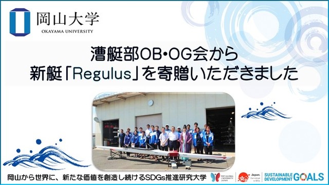 国立大学法人岡山大学(本部:岡山市北区、学長:槇野博史)は、岡山大学漕艇部OB・OGからなる旭水艇友会(きょくすいていゆうかい)から、新艇「Regulus」を寄贈いただきました。