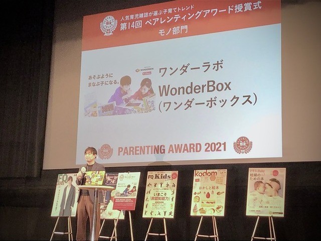 授賞式当日は、ワンダーラボ代表・川島が登壇し、「この度は、素敵な賞を受賞させていただき、大変嬉しく思っております。弊社は、世界中の子どもが本来持っている知的なわくわくを引き出すことをミッションにしています。ワンダーボックスも、子どもたちが遊ぶように学び、その様子を見て保護者の方も笑顔になれるサービスにしていきたいと思っています。」と受賞の喜びを語りました。