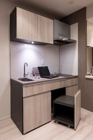 単身世帯向けの賃貸・分譲マンションに標準装備されている横幅約150cmのキッチンカウンターに、縦型2口コンロ(IH仕様)、シンク、横幅約56cmのワークスペースを配置。シンクにはキッチン天板と同材の人工大理石の蓋を備えることで、作業時には合わせて約110cmの作業空間を実現しました。