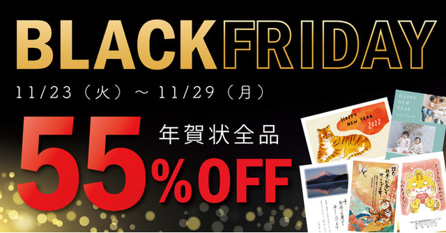 年賀状印刷販売サイト、れいわdeねんがでは11月23日(火)~11月29日(月)の7日間、ブラックフライデー特別セールを開催中です。3,000デザインから選べるイラスト年賀状はもちろん、ディズニーやジブリをはじめとした可愛いキャラクターデザインやおしゃれな写真年賀状がすべて、過去最大割引となる55%OFFで販売中です。
