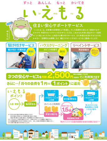 「いえもる」はお客様の住環境をより快適に、そして長期的な安心をご提供するサービスです。三和ペイントで外壁・屋根のメンテナンスをさせていただき、これからも大切に住み続ける住まいの中で「よく起こるトラブル」に対応した「水まわり」「カギ」「電器」「建具」などの緊急駆け付けサービスを提供。また快適な生活の質向上へ向けた「定期的なハウスクリーニング」など住まいに関するお悩みを電話一本から幅広くサポートを行います。