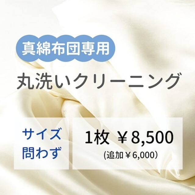 真綿布団専用の布団丸洗いクリーニングサービスです。布団の素材であるシルクを分析し、適したクリーニング工程を開発したことで、クリーニングが難しいとされる真綿布団の水洗いを実現しました。徹底した検品、極力摩擦を抑えた洗い、絹と同じ成分を使った洗剤や柔軟剤を用いることで、シルク本来の滑らかな手触りがよみがえります。側地が絹100%の物、小石丸綿も丸洗い可能です。